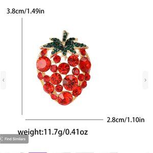 Vibrant strawberry-shaped brooch featuring dazzling red rhinestones and green leaf accents. Gold-plated setting ensures durability and timeless style.