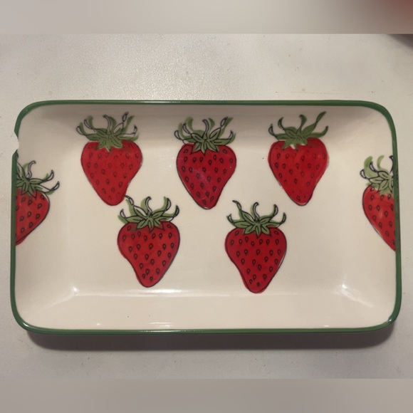 Add a touch of charm to your home with this delightful rectangular tray featuring a vibrant strawberry design. Perfect for serving or display. Does have a chip as shown in pictures.