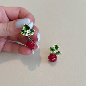 Add a playful touch to your outfit with these charming strawberry drop earrings. Featuring vibrant red strawberries and elegant gold leaves, these earrings are perfect for any occasion.