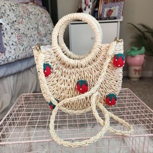 Charming straw tote bag with playful strawberry embellishments. Perfect for adding a touch of fun to any outfit.