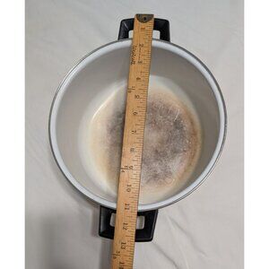 Enamel wear on interior base, minor scratches on handles.