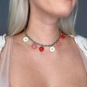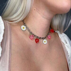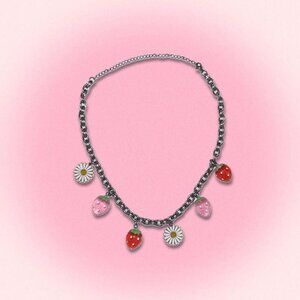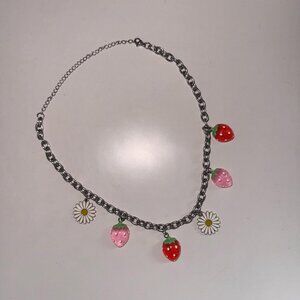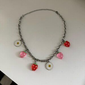 Daisy enamel pin charms with pink and red resin strawberries adorn this silver chain necklace. Only worn a handful of times. Cute and sweet! Chain is 17" long.