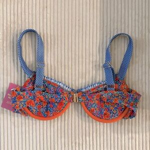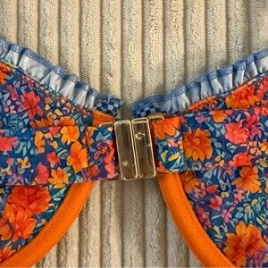 Smaller fit with adjustable shoulder straps and metal clasp on back; bright floral design