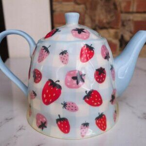 Charming teapot with a strawberry pattern. Features a light blue spout and handle.