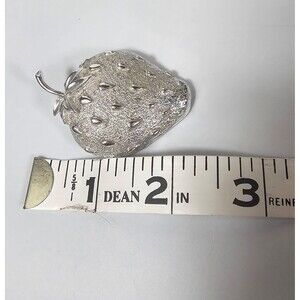 This vintage Sarah Coventry strawberry pin brooch is a charming piece of estate jewelry perfect for occasions like Mother's Day, birthday, or Valentine's Day. The silver tone metal brooch features a unique strawberry shape, signed by the brand. Measuring 2.5 inches in length, this fashion accessory adds a touch of art and whimsy to any outfit with its fruity theme. It would make a personalized and thoughtful gift for someone who appreciates vintage jewelry and feminine fashion.