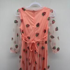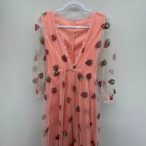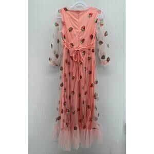 Strawberry Pink Red Sequin Mesh Coquette Ruffle 3/4 Sleeve Midi Dress