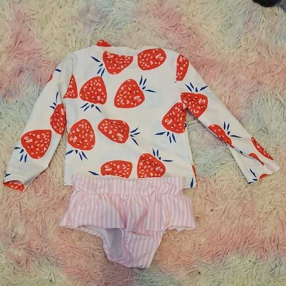 Charming rash guard set with a strawberry print. Features a ruffle bottom with pink and white stripes.