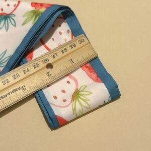 Chic scarf featuring a vibrant strawberry print. Accented with a blue trim.