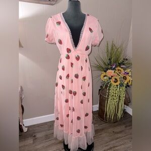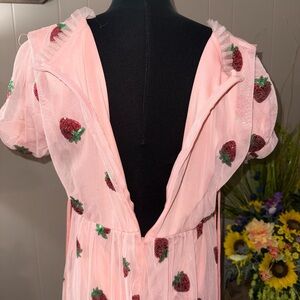 In like new condition. No issues or flaws. Zipper back. Lined with mesh overlay. All strawberries are made of sequins. Unbranded. Tagged size XL - fits up to size 12. Deep V neck.