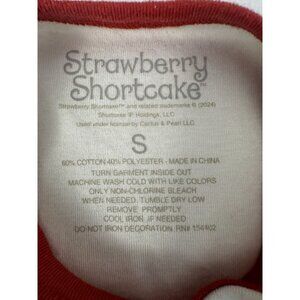 Strawberry Shortcake Baby Tee S Cropped Girlhoodcore Coquette Girl. Embrace the Girlhoodcore and Coquette trends with this adorable Strawberry Shortcake Baby Tee. This size Small t-shirt is rendered in a bright white and features a nostalgic graphic of the classic character. The style is a signature cropped fit with a comfortable round neck and short sleeves. Made from cotton blend, this soft jersey knit is fitted, perfect for high-waisted denim or skirts. It measures approximately 15.5 inches from pit to pit and 20 inches from shoulder to hem. Good pre-loved condition. Staining on front & back see pics.