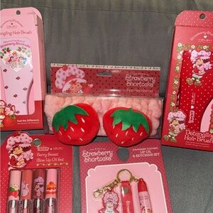 Adorable Strawberry Shortcake beauty set featuring a detangling hair brush, lip glosses, and a keychain. Perfect for fans of the classic character.