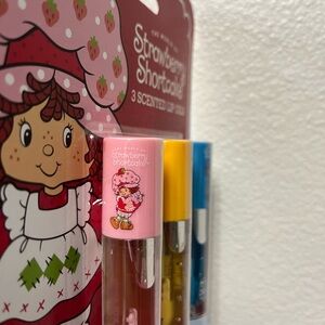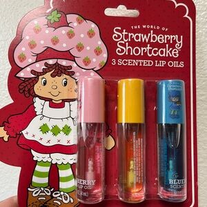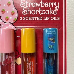 Set of three scented lip oils featuring Strawberry Shortcake design. Includes pink, yellow, and blue lip oils.