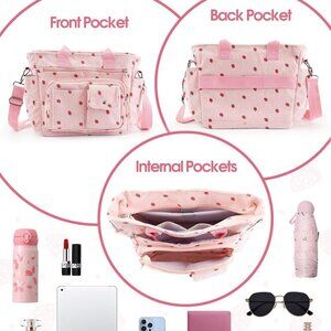 [ Roomy Multi Pocket Purse ] This strawberry bag is medium sized and has a larger capacity than other types of canvas bags, which can easily hold your work and study needs and meet the various needs of daily use. The adjustable strap allows you to use it as a crossbody bag or a shoulder bag.