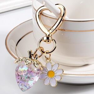 Strawberry iridescent color berry bag charm w/ white daisy and gold hear…