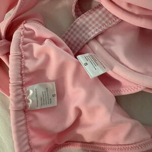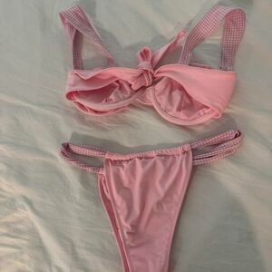 pink gingham, strawberry print, pastel swimwear, tie-front bikini, cheeky bottoms, summer beachwear, playful pattern, kawaii style, swim crop top, minimalist bikini