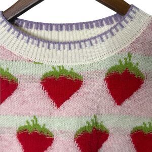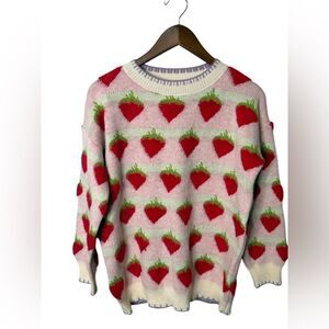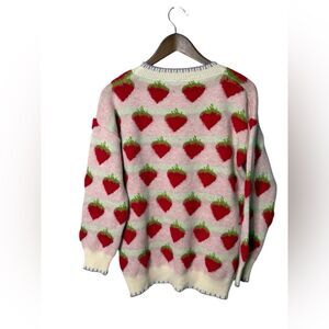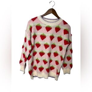 Strawberry sweater no size tag fits medium no materi tag. Soft fuzzy sweater. Good shape smoke free dog friendly home: fun funky print teen trendy measurements are approximately 21” bust and 25” length bin 50