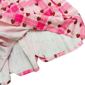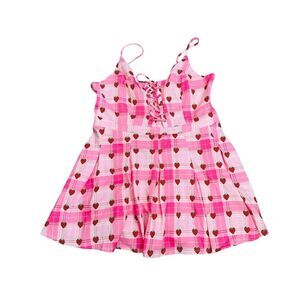 Charming pink plaid dress featuring a strawberry pattern. Perfect for a playful look.