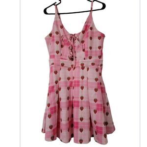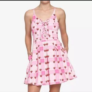 Stay sweet in this little pink number. Its pink plaid fabric is adorned with the most delectable strawberries. The dress bodice is a lace-up style with adjustable shoulder straps for that perfect fit.