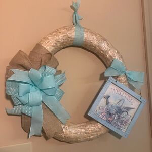 Straw wreath in aqua Marjorlien Bastin sign with burlap and aqua bow. Perfect for spring