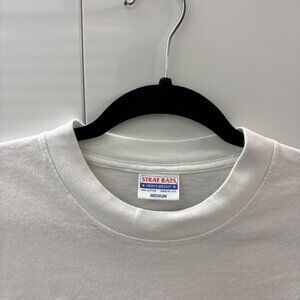 The Stray Rats Punk Retro Rodent Logo Tee in size Medium is a white cotton T-shirt featuring a solid pattern with a crew neck and short sleeves. The shirt is sublimated with a punk-themed logo, making it perfect for fans of the brand and those who appreciate a retro look. Machine washable for easy care, this regular fit shirt is ideal for men looking to express their unique style with a hint of rebellious punk flair.