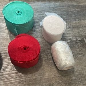 White and blue streamers are unopened. Teal is open, but never used. White and red, little less then half of a roll left. Balloon strings that were never opened.