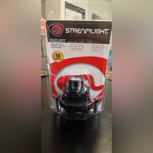 Streamlight headlamp is brand new and in the packaging, never worn. It is 50 lumens with hi and lo light settings. Comes with batteries and head strap but can also be clipped to a hat brim.