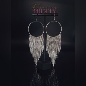Tapered rows of glittery white rhinestones cascade from the bottom of a shiny silver hoop, creating a glamorously glitzy fringe. Earring attaches to a standard fishhook fitting.