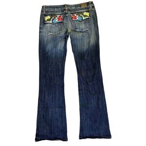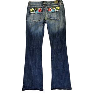 Vintage Street Denim jeans, women’s size 11x33, proudly made in the USA. These jeans feature vibrant floral embroidery on the back pockets, a classic blue wash, mid-rise fit, and a straight leg cut. A standout piece for any denim lover. No rips, holes, or stains.