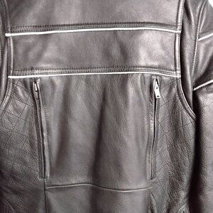 Removable liner ans also a hidden neck warmer in the inside of the back of the jacket, see pic . Also has pockets on the back. See pics.