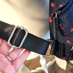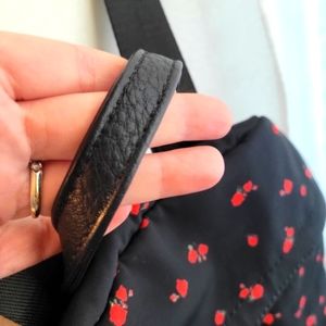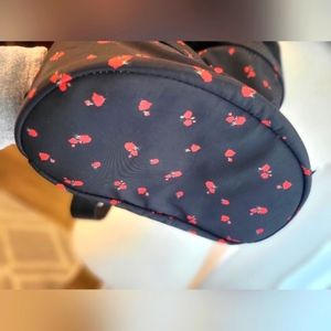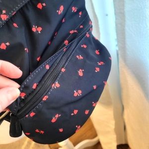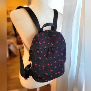 This Street Level Backpack has never been used. It is black with tiny red flowers. 2 zippered compartments. adjustable. has leather accents and straps as pictured. in excellent condition