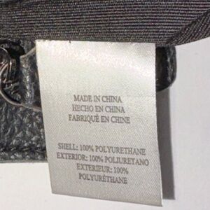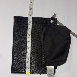 Stylish black textured clutch with a convenient wrist strap. Features a front zipper pocket for easy access.