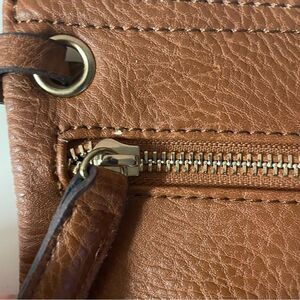 Cognac brown little zippered pouch that attaches to the larger tote bag. It has a little bit of cracking in the soft faux leather by the zipper, but does not affect the use of it. Still has a lot of life in it. Perfect to put smaller things in so you don’t lose them in a larger bag. Feel free to ask questions or make an offer!