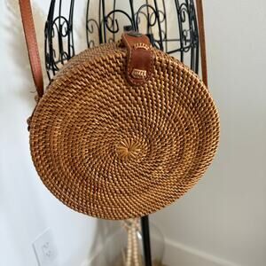 Street Level Handwoven Round Rattan Leather Straps Crossbody Shoulder Bag
