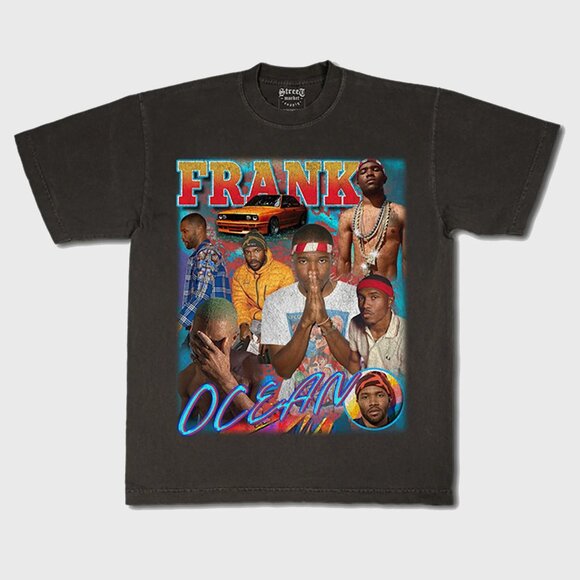 The Street Market Supply Frank Ocean Tee in Vintage Black, size Medium, is a new men's T-shirt made of cotton. It features short sleeves, a crew neck, and is machine washable. The tee is designed for regular sizing, with a classic black color perfect for summer, fall, or spring. Manufactured in the United States, this T-shirt is a stylish and versatile addition to any wardrobe, representing the Street Market Supply brand with a modern twist on a vintage style.