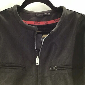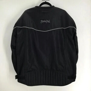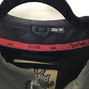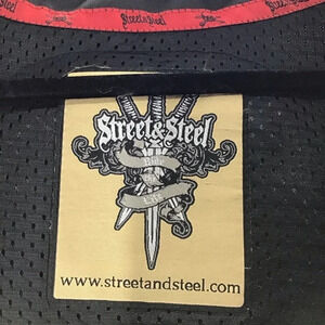 Street & Steel Armored padded motorcycle riding jacket. Features full front zip-up, several zip pockets on front, Velcro adjustable sleeves & waist & logo on sleeve & back.