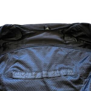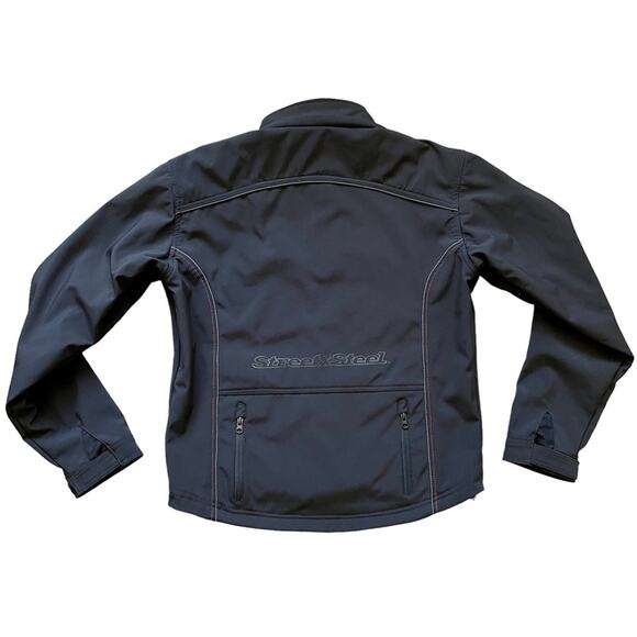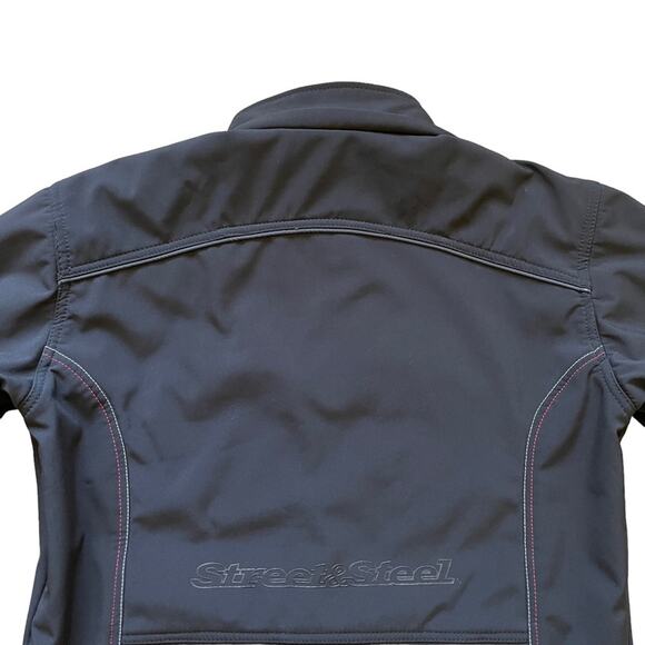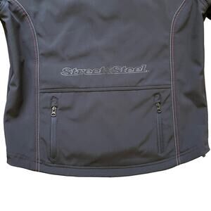 Street & Steel Black’d Out motorcycle riding jacket size Medium in great preowned condition. Material is breathable as well as wind and water resistant. Reflective trim and logo with double zippered back pocket. Longer back length to cover body when riding. Velcro mesh pockets inside to insert shoulder, elbow, and spine protection pads (not included). Velcro cuffs and inside waist toggles. Underarm mesh pit zips for maximum breathability.