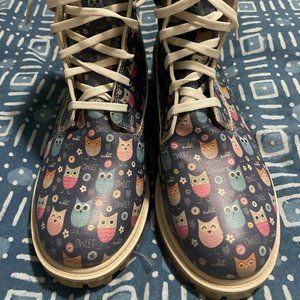 Streetfly brand vegan leather navy blue with colorful owl print lug-soled boot. Size 9M/EU39, runs a little large. New/Never worn.