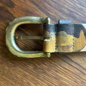 Painted and slightly textured leather. The buckle is hammered brass (looks handmade, but I don't know for sure). Not sure of the age but I believe it to be vintage. Excellent condition and quality.