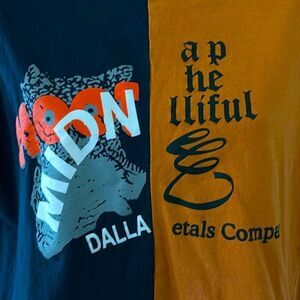 Super unique split graphic tee in navy + golden mustard — such a cool streetwear vibe. Easy to throw on with jeans, cargos, or cutoff shorts. Soft + comfy cotton blend.