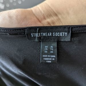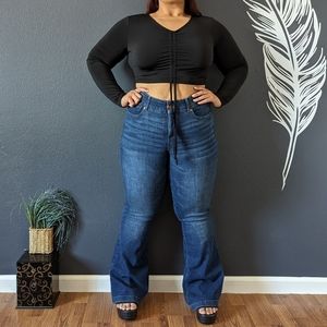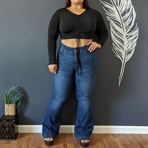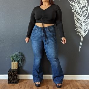 Chic black crop top. Long sleeves. Ruched front detail. Perfect for casual outings.