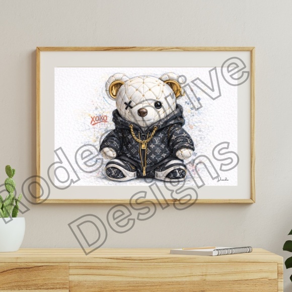 Add instant streetwear + luxury-inspired style to your space with this 17x11 teddy bear art print. Featuring a cute-but-edgy bear in a monogram-style hoodie, this piece brings a modern hypebeast / urban gallery wall vibe to any room.