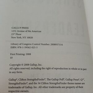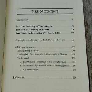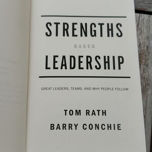 This is a hardback book titled Strengths Baaed Leadership by Tom Rath and Barry Conchie. There is no writing on book, but does show some yellowing throughout. Great read.
