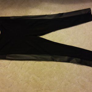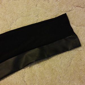 Never worn. These pants are slim fit, tight to the leg, fit more like legging. Faux leather “stripe” down side of both legs with elastic above faux leather at waist band. Polyester/Spandex Waist laid flat: 19” Length: 40.5”