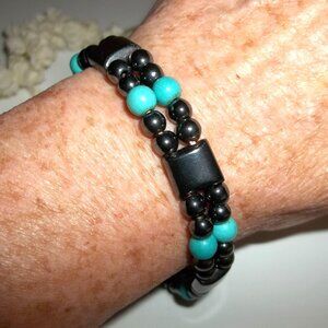 Stretch Bracelet Dark Grey Hematite and Turquoise Blue Woman Jewelry Bead D143