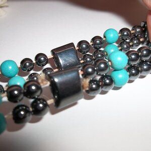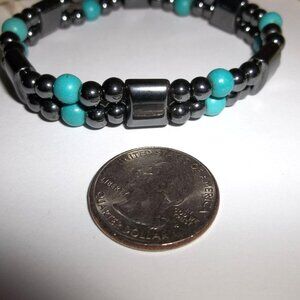 This pre-owned bracelet is very cute. It has dark grey metallic hematite beads and turquoise blue colored beads. It is a stretch bracelet. Measures about 8 inches around and 1/2 inch wide. People are sure to give you lots of compliments when you wear it. Buy it now before someone else does!