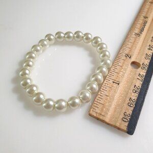 Timeless faux pearl stretch bracelet with white beads. Features a classic design, perfect for various styles. Comfortable fit with durable elasticized band. Elegant jewelry accessory.
