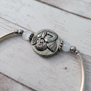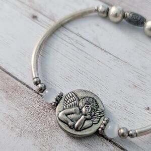 Inner circumference measures about 7" unstretched. Marks to the cherub charm. Silver tone has slightly goldened. Bead on opposite side of the charm is more of a grey than silver tone - possible due to tarnish. Some marks, tarnish and signs of wear.