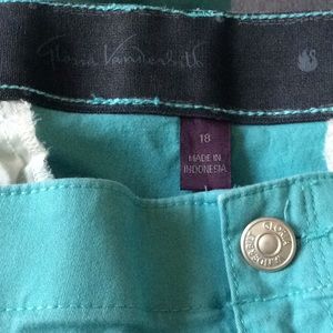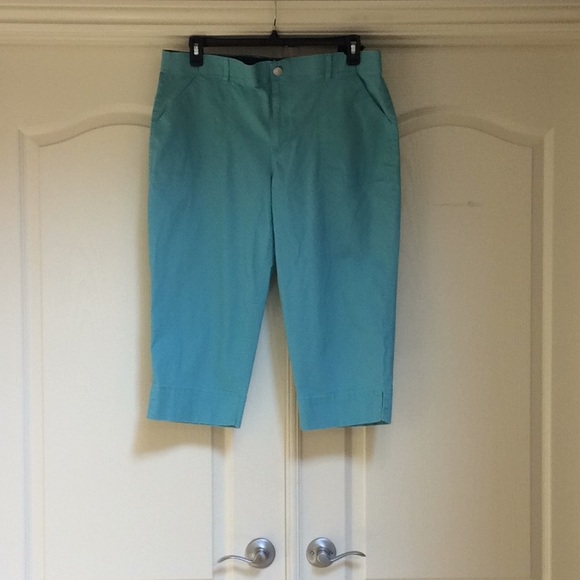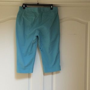 Nice dusty aqua colored crops. They have a nice stretch and hit at mid calf. Very comfy