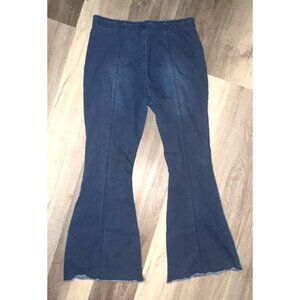 Versatile denim flares designed with comfort in mind, featuring an elastic waistband and soft stretch fabric that moves with your body. Subtle faded wash creates a lived-in aesthetic with classic center seam detailing and gently frayed hem edges.