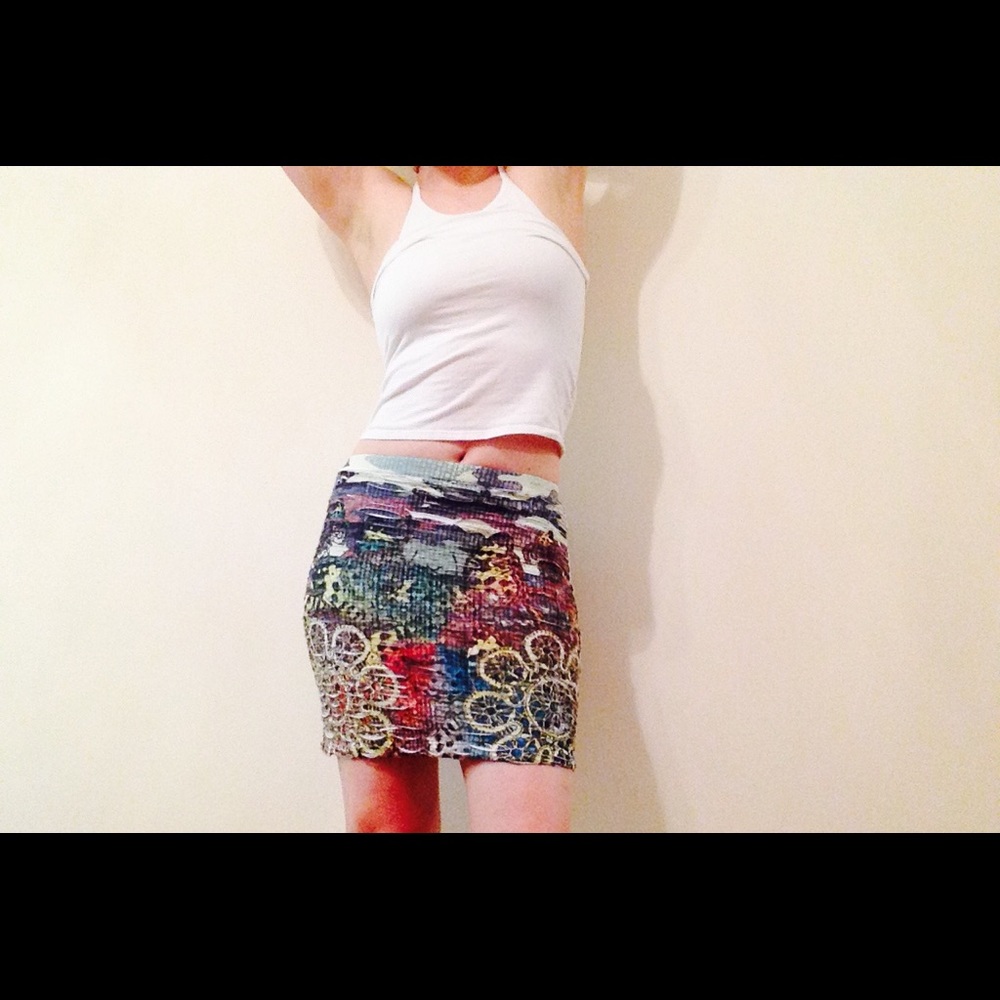 Light, comfortable, stretchy, colorful. Matches with so many tops! Easy to wash and wear. Very unique print- got this at a little boutique in Sedona, AZ. In great condition (the fabric holds up well since its stretchy)
